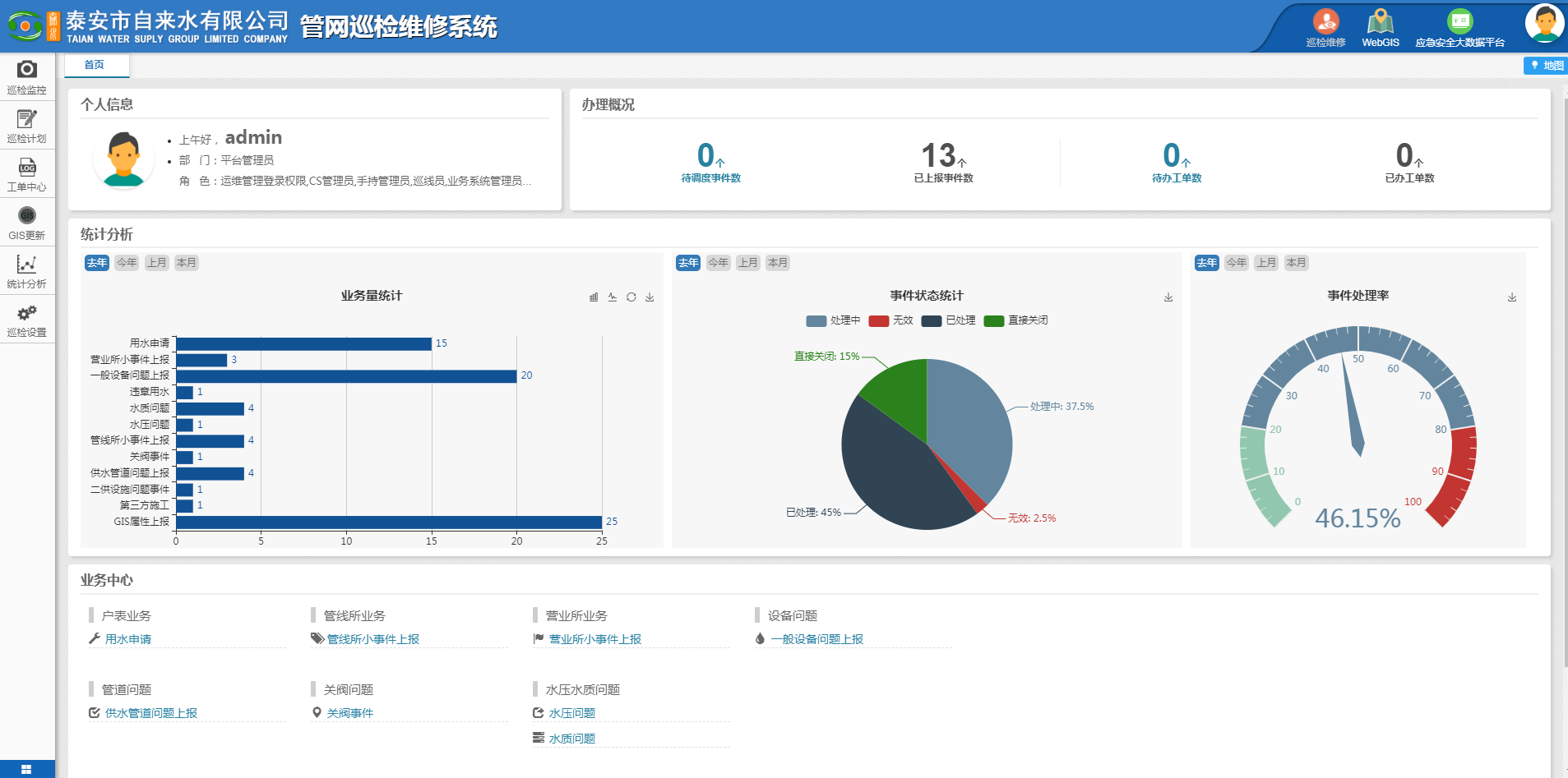 ????????公司領(lǐng)導(dǎo)組織有關(guān)部門、人員對(duì)供水GIS系統(tǒng)建設(shè)進(jìn)行了認(rèn)真細(xì)致的考察、調(diào)研,對(duì)公司業(yè)務(wù)流程梳理及系統(tǒng)接口需求進(jìn)行了溝通整理。公司供水GIS系統(tǒng)包含四大模塊,有供水管理地理信息系統(tǒng)C/S(內(nèi)網(wǎng)系統(tǒng))、供水管網(wǎng)地理信息系統(tǒng)B/S(網(wǎng)頁客戶端)、供水管網(wǎng)巡檢系統(tǒng)、供水管網(wǎng)維修系統(tǒng),四大模塊中包含數(shù)據(jù)管理、數(shù)據(jù)分析、工單系統(tǒng)、巡線管理、移動(dòng)終端監(jiān)控、運(yùn)維管理等46項(xiàng)功能。項(xiàng)目自2020年4月初正式啟動(dòng), 2020年6月中旬完成四大模塊搭建及相關(guān)功能調(diào)試。